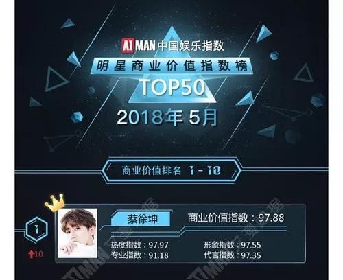2018年,通過(guò)《偶像練習(xí)生》重新出道的蔡徐坤成了新流量的代言人。艾漫數(shù)據(jù)發(fā)布的2018年5月“中國(guó)娛樂(lè)指數(shù)榜明星商業(yè)價(jià)值指數(shù)榜”中,僅僅通過(guò)《偶像練習(xí)生》出道一個(gè)月的蔡徐坤直接躍至榜首,并在2018年1月—5月的熱議指數(shù)中遠(yuǎn)超“歸國(guó)四子”。