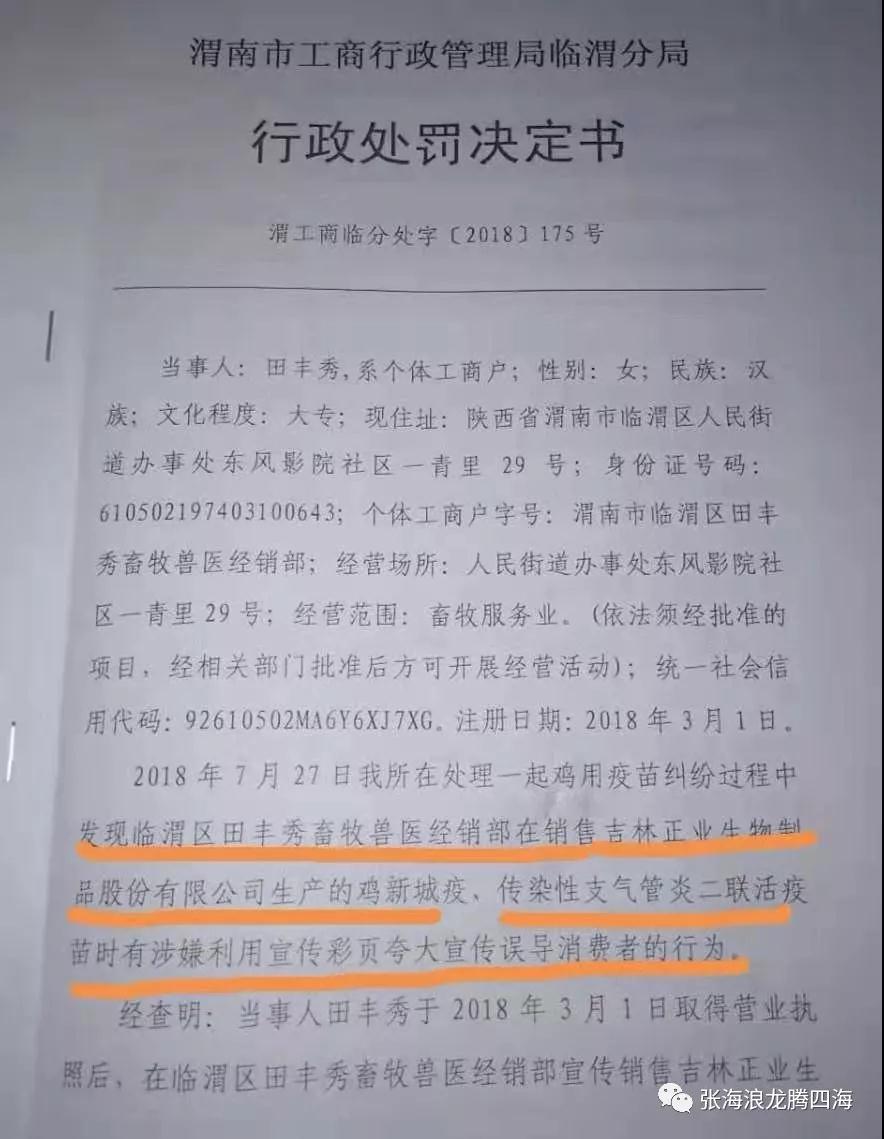 2018年7月27日,陜西省渭南市工商行政管理局臨渭分局就吉林正業(yè)生物渭南經(jīng)銷商在推廣相關(guān)疫苗產(chǎn)品時涉嫌夸大宣傳和質(zhì)量問題造成渭南興塬禽業(yè)及其各地養(yǎng)殖戶重大經(jīng)濟(jì)損失一事正式立案,經(jīng)過大量走訪、取證和最后聽證,于2018年11月2日作出了渭工商臨分處字【2018】175號《行政處罰決定書》。吉林正業(yè)生物的宣傳彩頁中就“雞新城疫、傳染性支氣管炎二聯(lián)活疫苗(La Sota株+H120株)”增加了“LTD3-A+4/91株”內(nèi)容,該行為屬夸大宣傳誤導(dǎo)消費(fèi)者的行為,處行政罰款50000元人民幣。