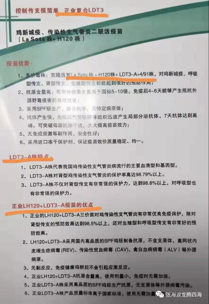 吉林正業(yè)生物在“雞新城疫、傳染性支氣管炎二聯(lián)活疫苗(La Sota株+H120株)”相關(guān)宣傳彩頁就其疫苗優(yōu)勢第一項(xiàng)“多價毒株”中,就旗幟鮮明的標(biāo)榜“克隆選育La Sota株+H120株+LTD3-A+4/91株,對雞新城疫、呼吸型傳支、腎型傳支、生殖性傳支都能起到很好的預(yù)防作用”,在其推薦的疫苗免疫程序相關(guān)公開資料上也同步顯示,其“新支腎二聯(lián)弱毒苗”的“毒株”包含“La Sota株+H120株+LTD3-A+4/91株”。同時,還專門就“LTD3-A株”特點(diǎn)做了三方面的詳盡說明——